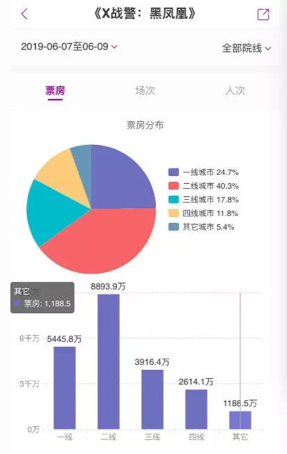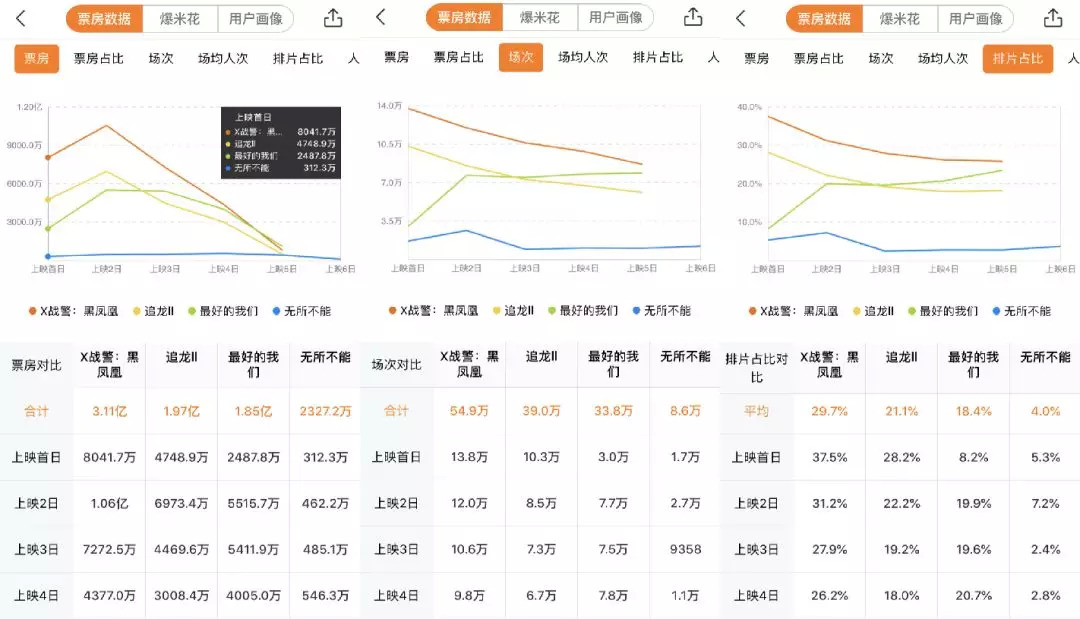 作为《X战警》系列收官之作,《黑凤凰》在端午档以2.2亿元票房成为档期冠军,但三天票房、场次、排片占比,都出现了不同程度的下滑,但始终保持在第一位。