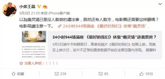 《追龙2》导演王晶也发微博公开质疑《最好的我们》“幽灵场”事件。呼吁电影局相关部门关注。