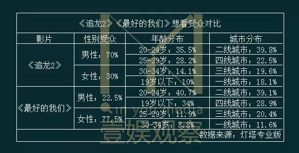 《追龙2》《最好的我们》想看受众对比图。来自于灯塔数据