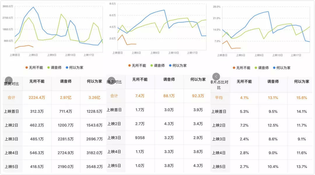 《无所不能》《调音师》《何以为家》票房、场次、排片占比对比图