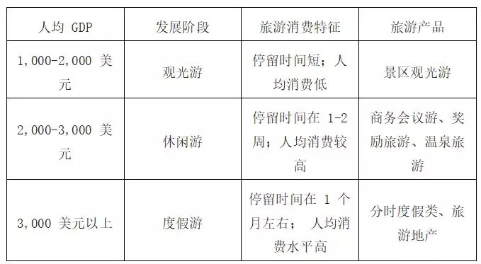 根据旅游消费发展的规律,旅游消费先后经历观光游—休闲游—度假游三个阶段,旅游业的发展阶段与消费特征如下: