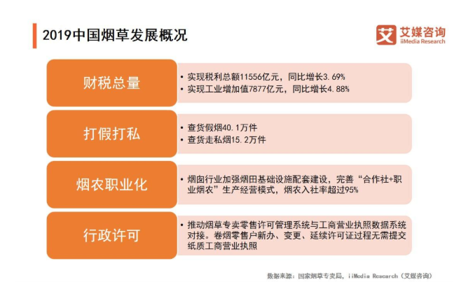 iiMedia Research(艾媒咨询)数据显示,2017年中国烟草消费量占全球44%。另外,2017年中国卷烟实现销售收入14350亿元,收入增幅在经历连续两年回落及2016年负增长后止跌回升,比2016年高8.3%。2018年,烟草行业实现税利总额11556亿元,同比增长3.69%。