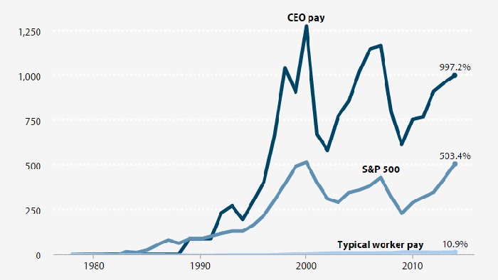 经通货膨胀因素调整后,企业CEO的薪酬福利在1978年约为150万美元/年。到了2014年,CEO的薪酬福利却达到1630万美元/年,增长997%。这一涨幅甚至是同期美国股市涨幅的两倍。