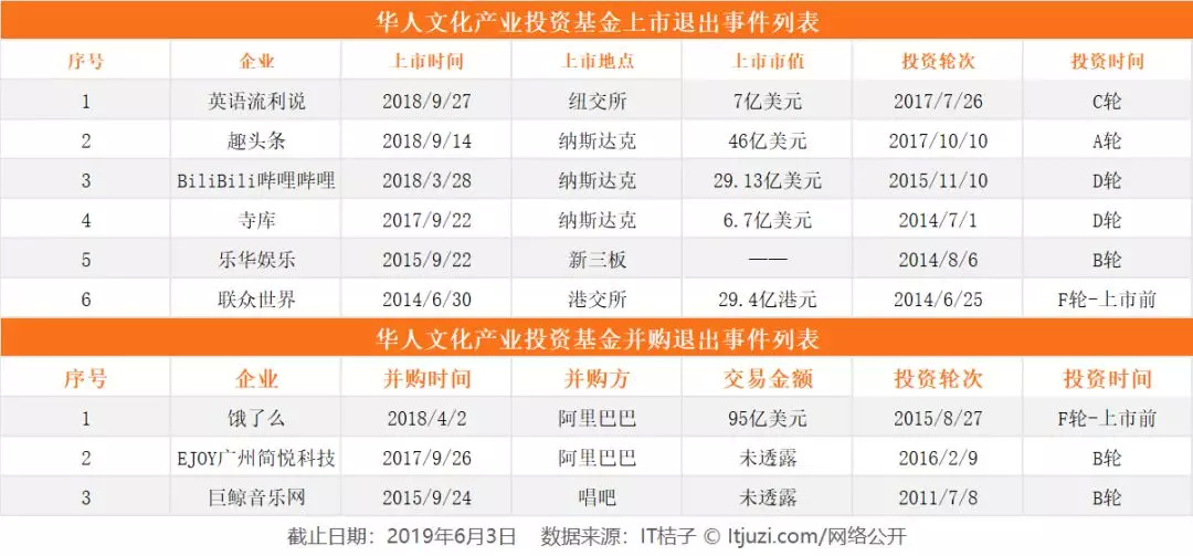 2018 年是华人文化退出案例最为丰富的一年,一方面英语流利说、哔哩哔哩、趣头条成功上市:2018 年 9 月 27 日英语流利说登录纽交所;9 月 14 日趣头条在纳斯达克挂牌;3 月 28 日,哔哩哔哩也成功在纳斯达克敲钟。另一方面饿了么被阿里巴巴以 95 亿美元的价格收购,成为近年巨额并购案例之一。