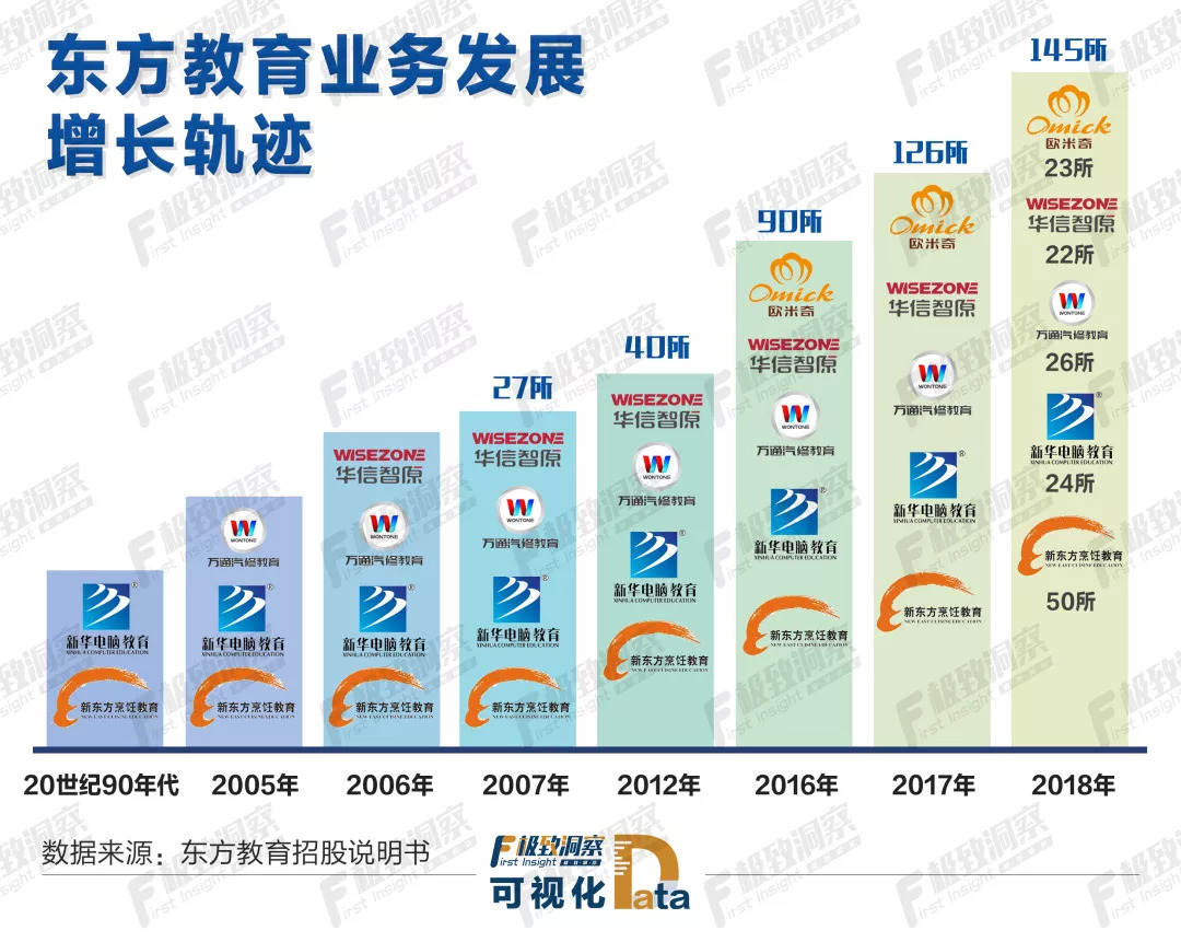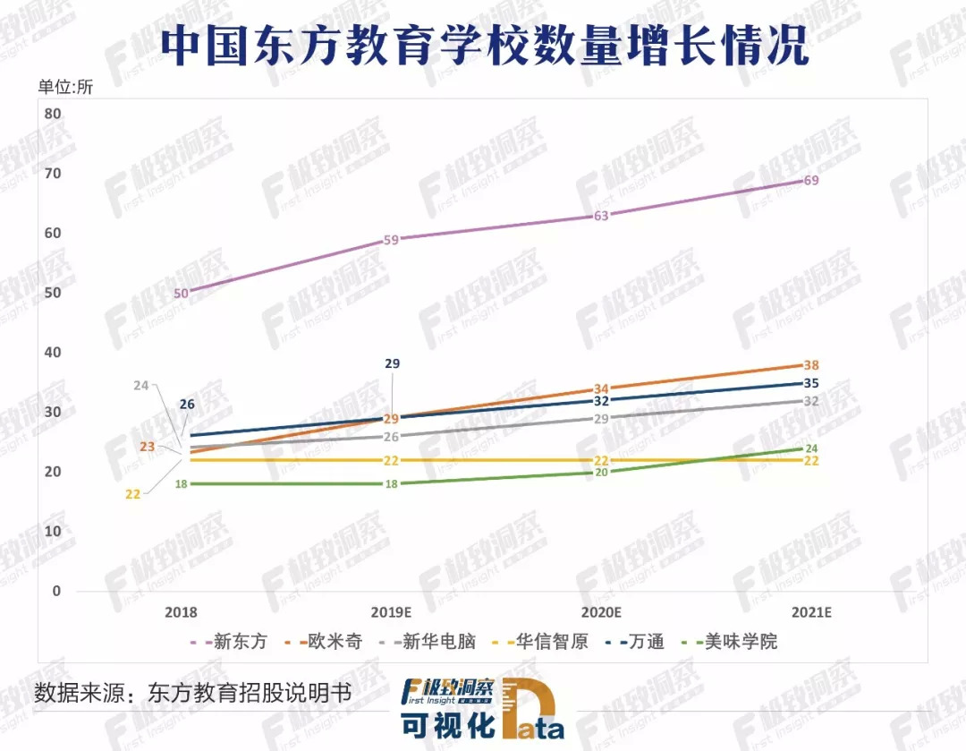 2017年,中国东方教育运营学校数目达到126所,较2016年增长40%。到2018年,中国东方教育运营学校及中心达到163所。截至2019年5月20日,中国东方教育运营学校及中心达到168所,其中,新东方烹饪52所、新华电脑24所、万通汽车27所、欧米奇所辖学校24所、华信智原DT人才培训基地所辖学校22所,美味学院旗下私人定制烹饪体验中心19个。经过近31年的发展,中国东方教育已经成为技能培训优质的教育企业。
