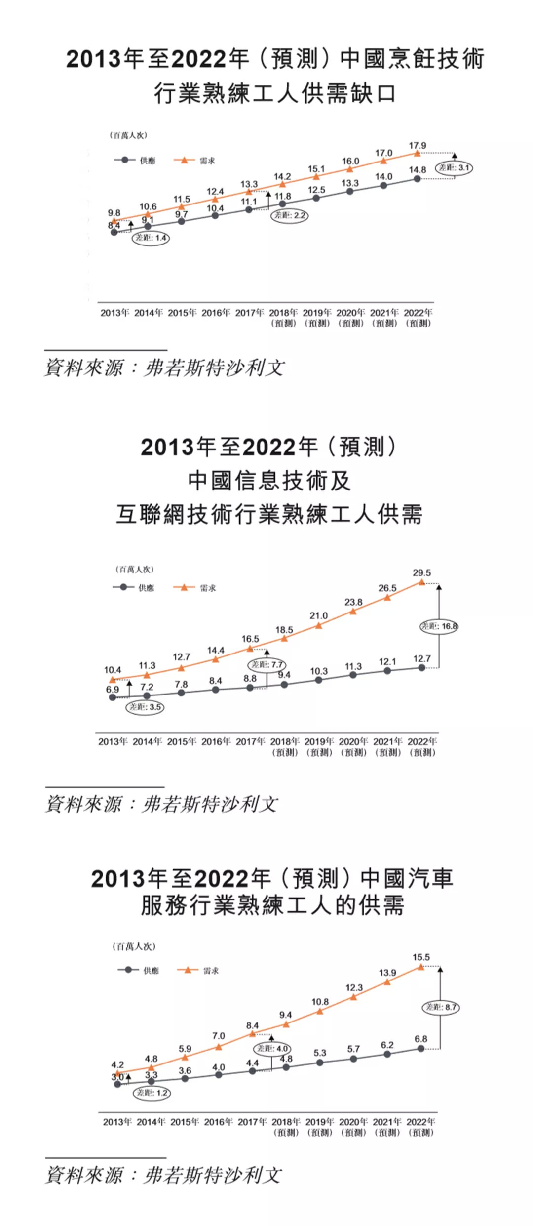 根据弗若斯特沙利文的统计,2017年,中国烹饪技术、信息技术和汽车服务行业熟练工人供需缺口分别为220万人、770万人和400万人。而3大行业供需缺口将在2022年分别达到310万人、1680万人和870万人。面对行业熟练工人供需的缺口,职业教育成为最快补足缺口的方式。