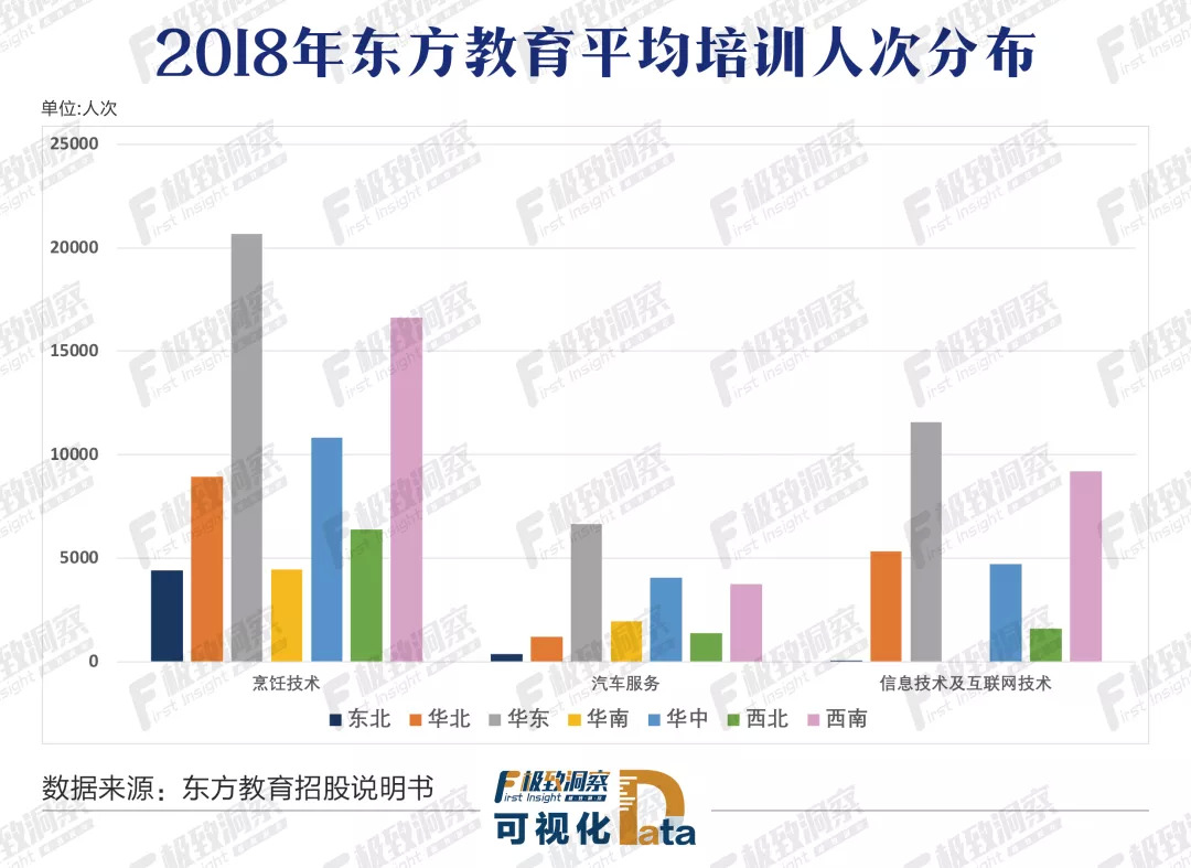 从地域分布来看,华东地区和西南地区为中国东方教育主要的培训区域,无论是烹饪技术、信息技术及互联网技术还是汽车服务,两个地区均占有非常大的比重。这与我国人口分布情况基本吻合。