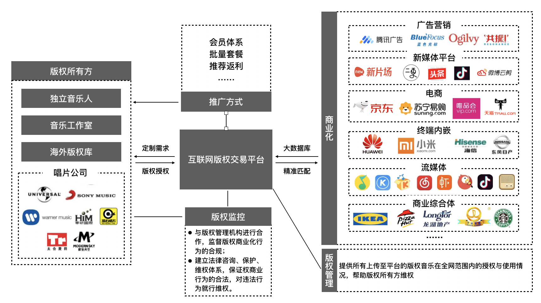 正如前面所提到的一个现象,腾讯音乐对V.Fine等版权分发和管理平台的注意,和V.Fine在垂直业态上的正向循环不无关系。利用对上游资源的整合,来为音乐人搭建透明、公开的体系化版权交易平台,从而进一步拓展音乐的盈利模式。例如V.Fine与腾讯广告、新片场等合作尝试点击效果计费、利益分成的模式,将音乐版权进行买卖分离的电商化运作。