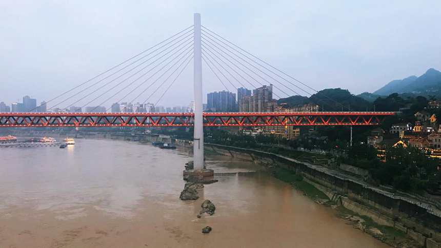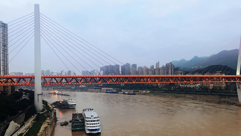 车厢的两边的车窗半开,江风从外面灌进去,给挤在狭小空间里的人们带去凉意。人们荡过下方的明黄墙面的湖广会馆,缓缓前行到江上,脚下是浑黄的江水,眼前是横跨两岸的东水门大桥。