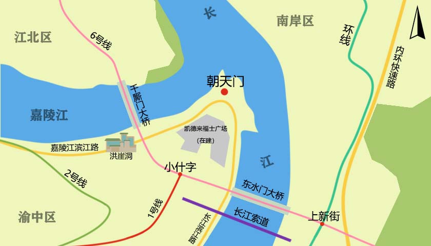 每当初夏仲秋,站在朝天门广场上便能看到暗绿的嘉陵江水便和浑黄的长江水碰撞激荡,呈泾渭分明之势,远看就像是火锅中的“鸳鸯锅”。