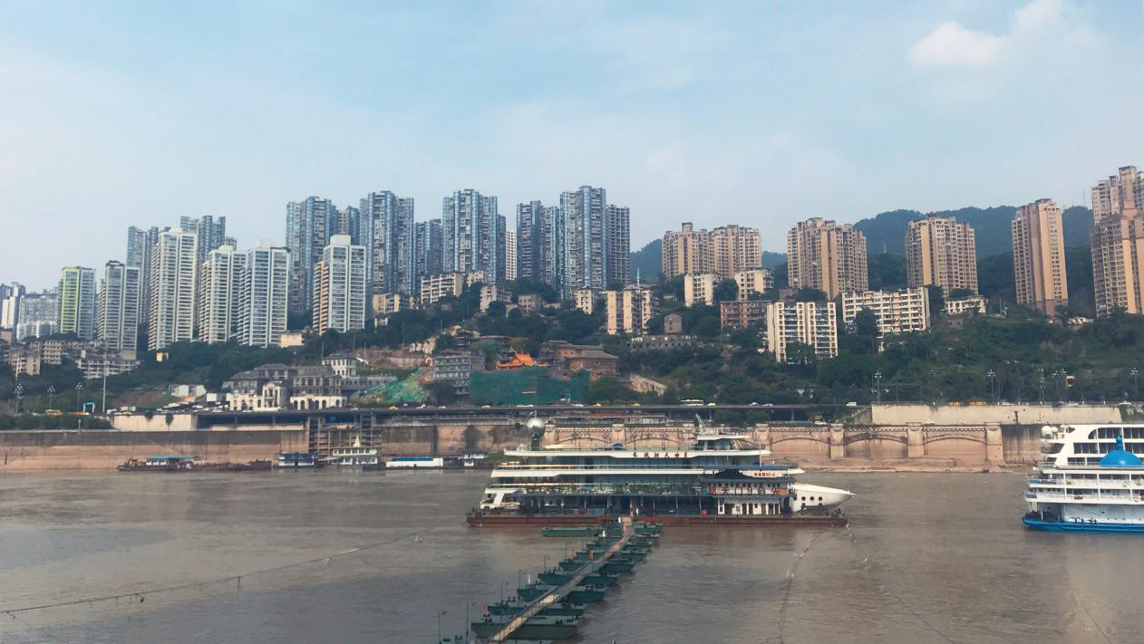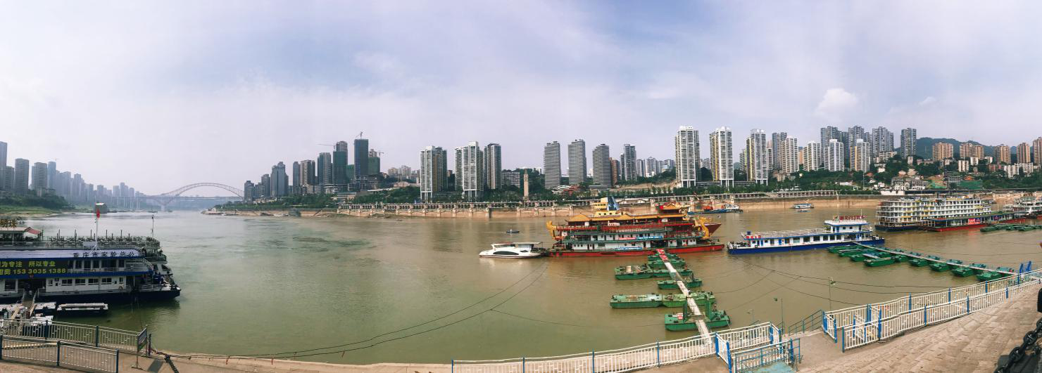 码头上停靠着各种邮轮,层层石梯从路面一路下到水边。哪怕是在晴天,山城的雾气也使得远方的景色变得迷蒙模糊,岸边的高楼和江上架起的桥梁若隐若现。