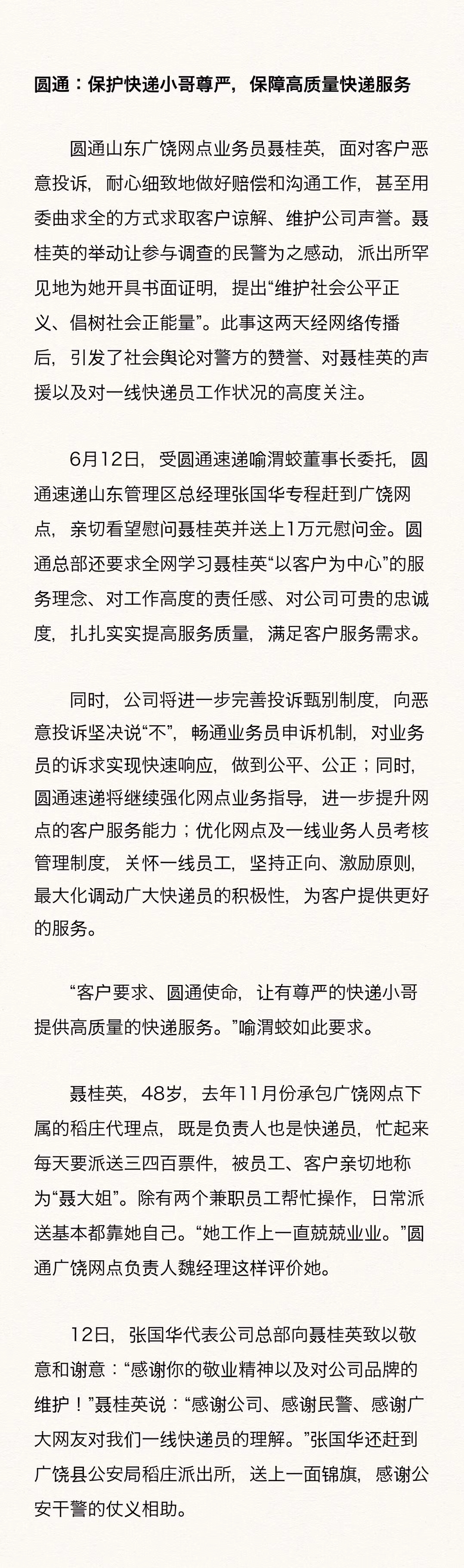 6月12日深夜,圆通速递官方公开就山东广饶一48岁女快递员遭投诉后下跪事件再次作出回应,圆通山东管理区总经理已为聂桂英送上1万元慰问金,并要求全网学习聂桂英的服务理念。与此同时,圆通速递还表示,将进一步完善投诉甄别制度,强化网点业务指导,优化考核制度。