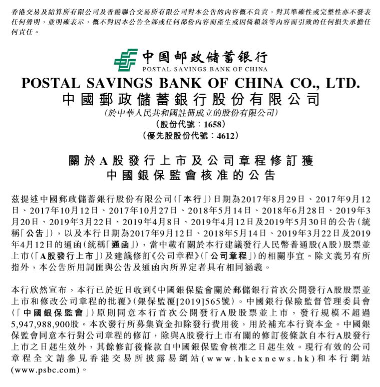 6月12日晚间,邮储银行(01658.HK)于港交所发布公告称,该行已于近日收到《中国银保监会关于邮储银行首次公开发行A股股票并上市和修改公司章程的批复》,原则同意该行首次公开发行A股股票并上市。发行规模不超过59.48亿股。