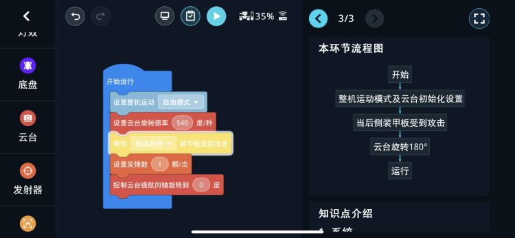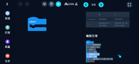 比如通过拖拽尝试制作一个“挨打反击”的程序,右侧可以切换机器人FPV状态以及打开指南和尝试运行。