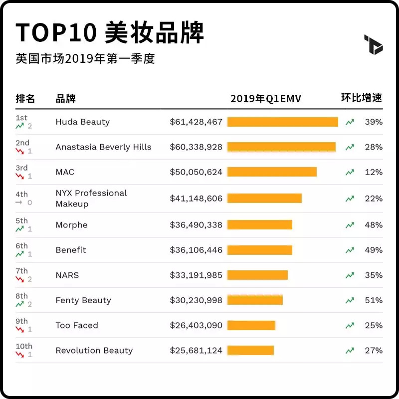 美宝莲公布第一季度EMV为220万美元,未进入TOP10品牌,但季度环比增长80%。