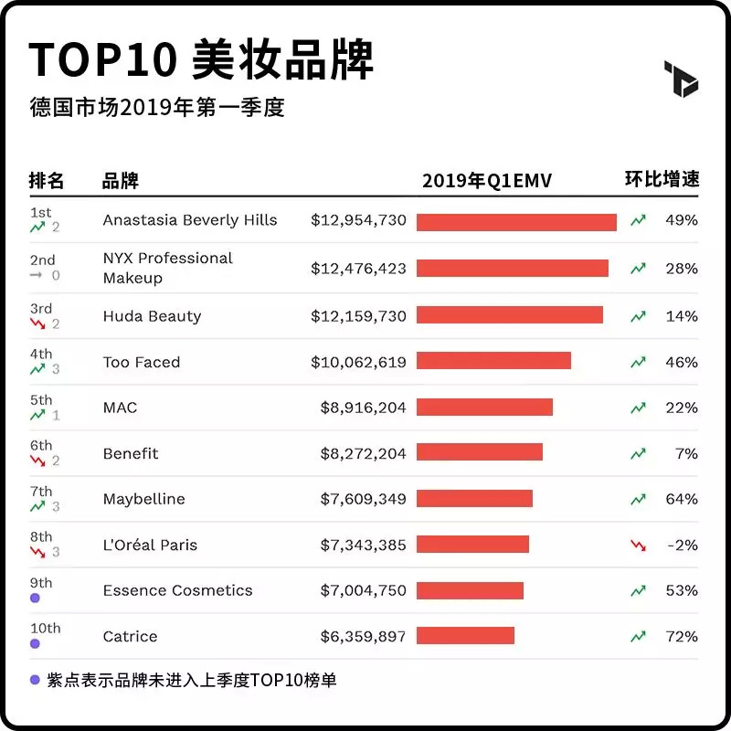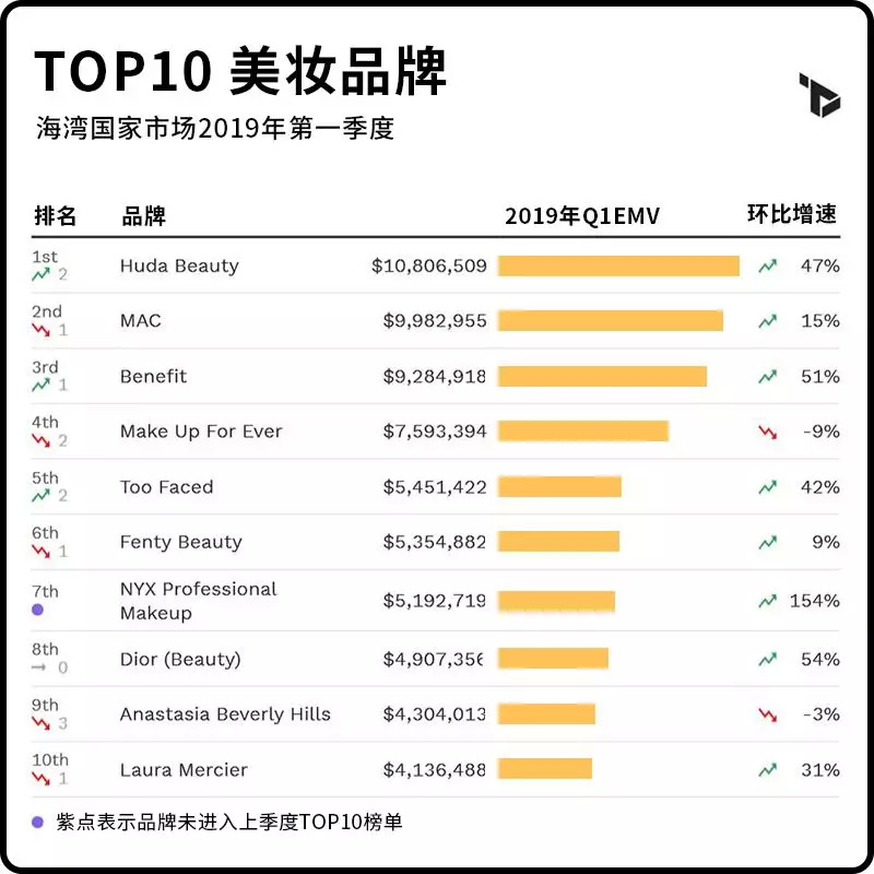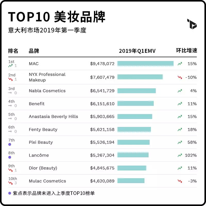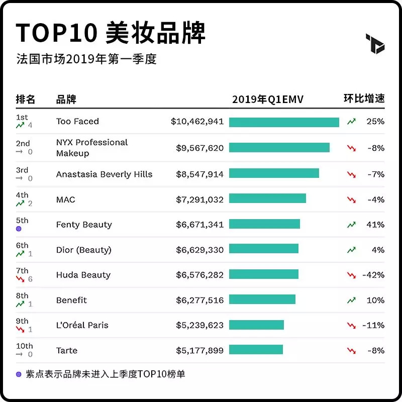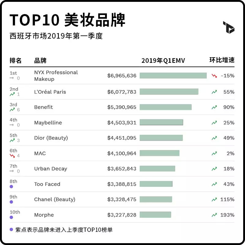 香奈儿(Chanel Beauty)以330万美元的EMV首次进入前十,季度环比增长115%。