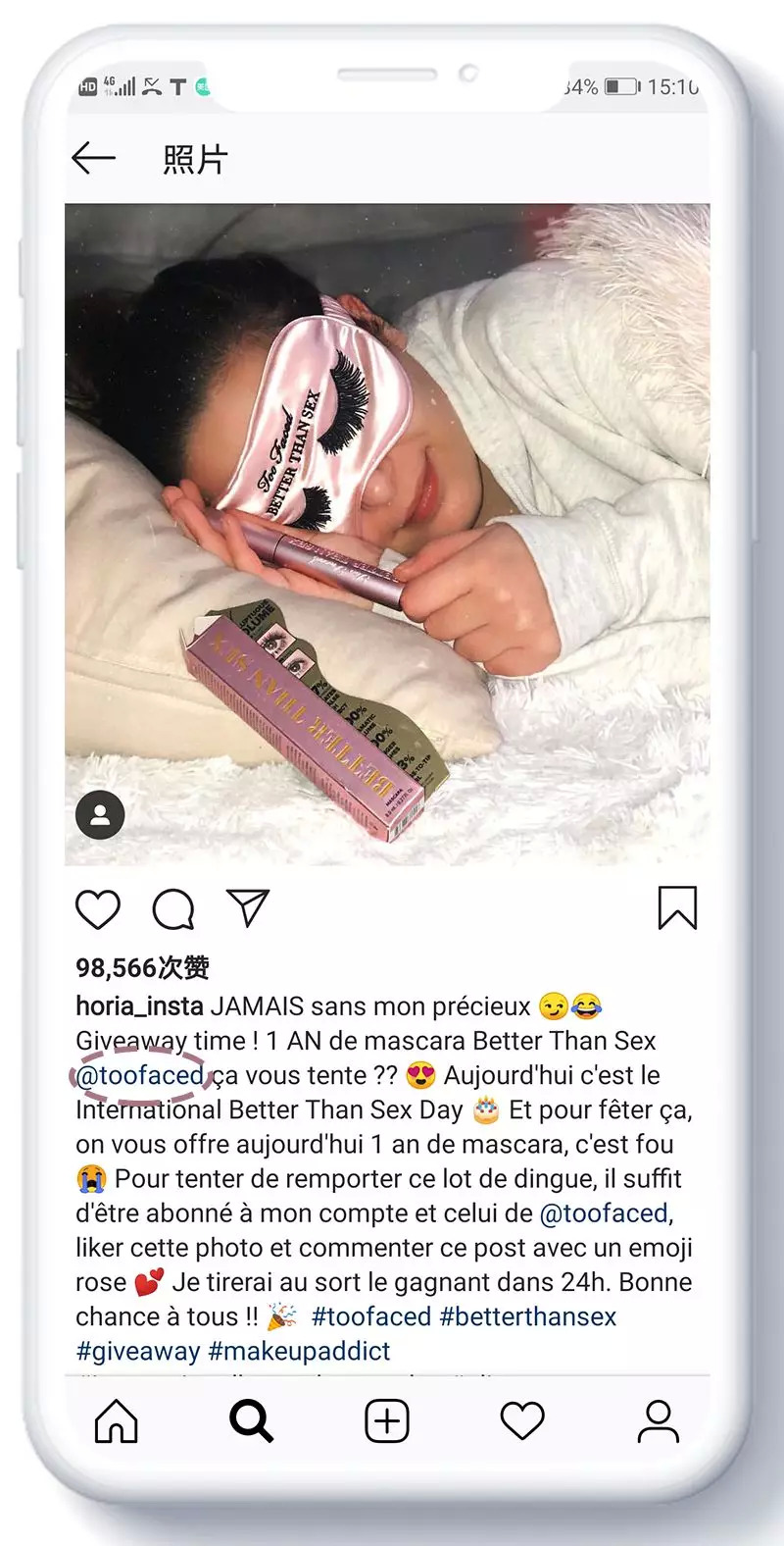 2月9日,Too faced举办了“Better Than Sex Day”(比性更好)的庆祝活动,邀请Shannon Harris (@shaaanxo)和Brittney Saunders (@brittney_saunders)等KOL在Instagram上分享Better Than Sex Day睫毛膏。