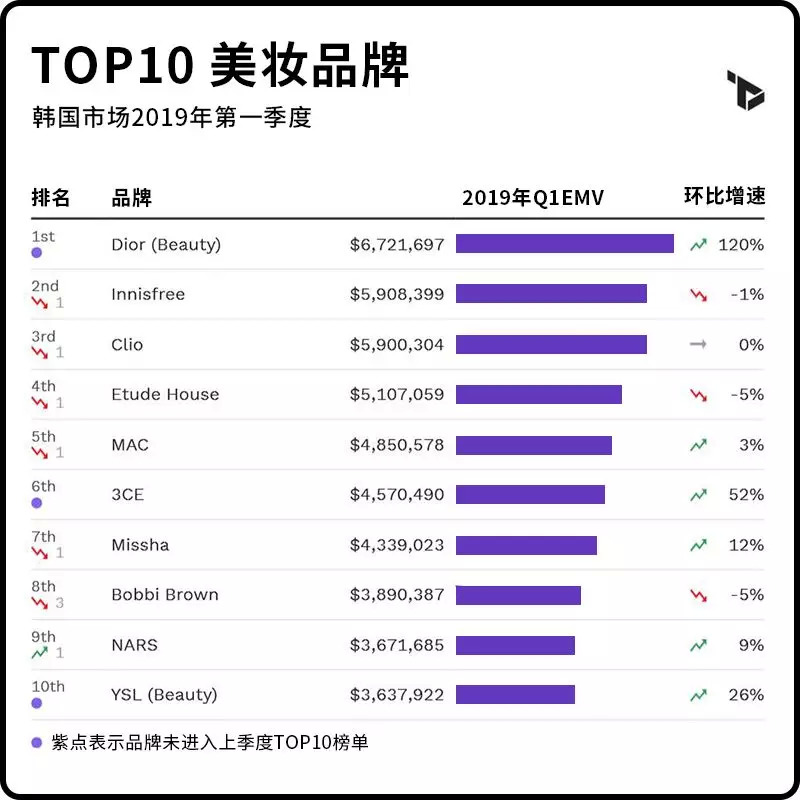 迪奥美容(Dior Beauty)引领韩国市场前十名,从2018年第四季度到第一季度,其EMV增长了120%达到670万美元。