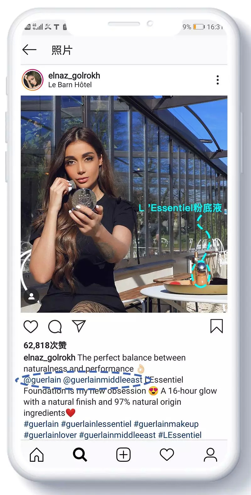 为了推广其新推出的L 'Essentiel粉底液,该品牌邀请了埃尔纳兹·戈洛克(Elnaz Golrokh, @elnaz_golrokh)等KOL与超级名模纳塔莉亚·沃迪亚诺娃(Natalia Vodianova, @natasupernova)会面,后者是该粉底液的官方代言人。