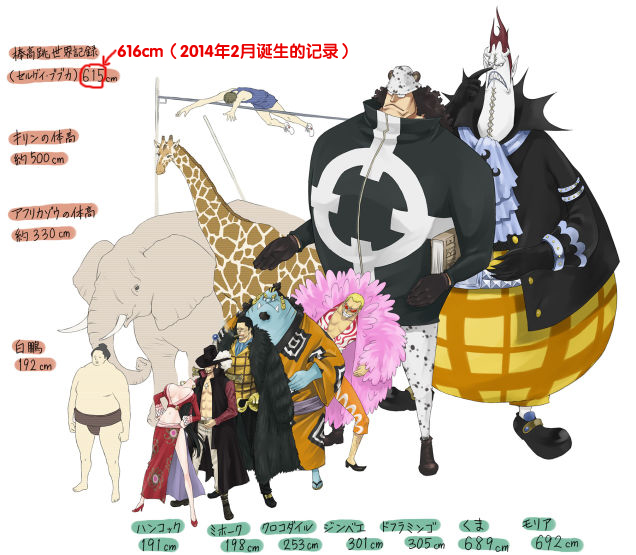 日本相扑运动员白鹏翔有1米92高,一头大象一般高3.3米左右,一只长颈鹿伸长脖子一般高约5米,人类撑杆跳的世界最高纪录为6.16米。以上这些数据,《海贼王》里的若干角色只要秀一下身高就能刷到了。