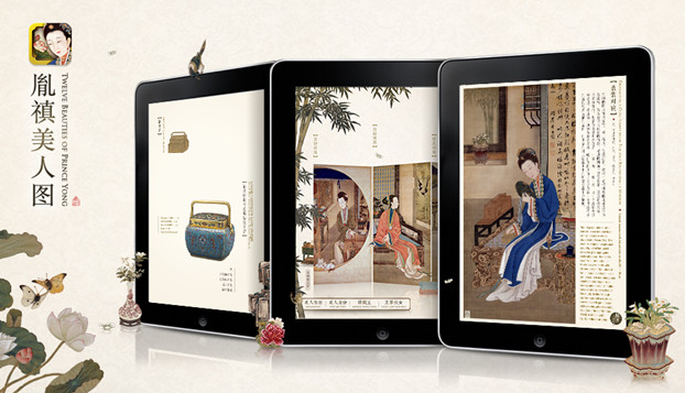 2013年5月,资料信息部推出了历经一年多制作的首个iPad应用《胤禛美人图》。怎么,纠结四爷居然不是只爱马尔泰·若曦或心心念着纯元皇后?放心,图中展示的12位或品茶、或抚琴的美女和四爷都是清白的,她们只曾在四爷用过的屏风上出现。这款APP设计得颇为精致,除了细部可以放大观赏,图中的部分物件还可以点开查看备注。