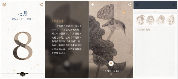《每日故宫》是资料信息部从iPad应用到手机应用的转型之作。“用手机的人还是比iPad多。”庄颖解释道,“在手机上用的,不能很大容量,我们就开始想能不能去做一个轻量化的东西。”为了贴合用户使用手机碎片化的习惯,《每日故宫》每天打开30秒以内就能看完,而每一天又都有新的内容。但由于故宫藏品太多,逐件展示不太现实。