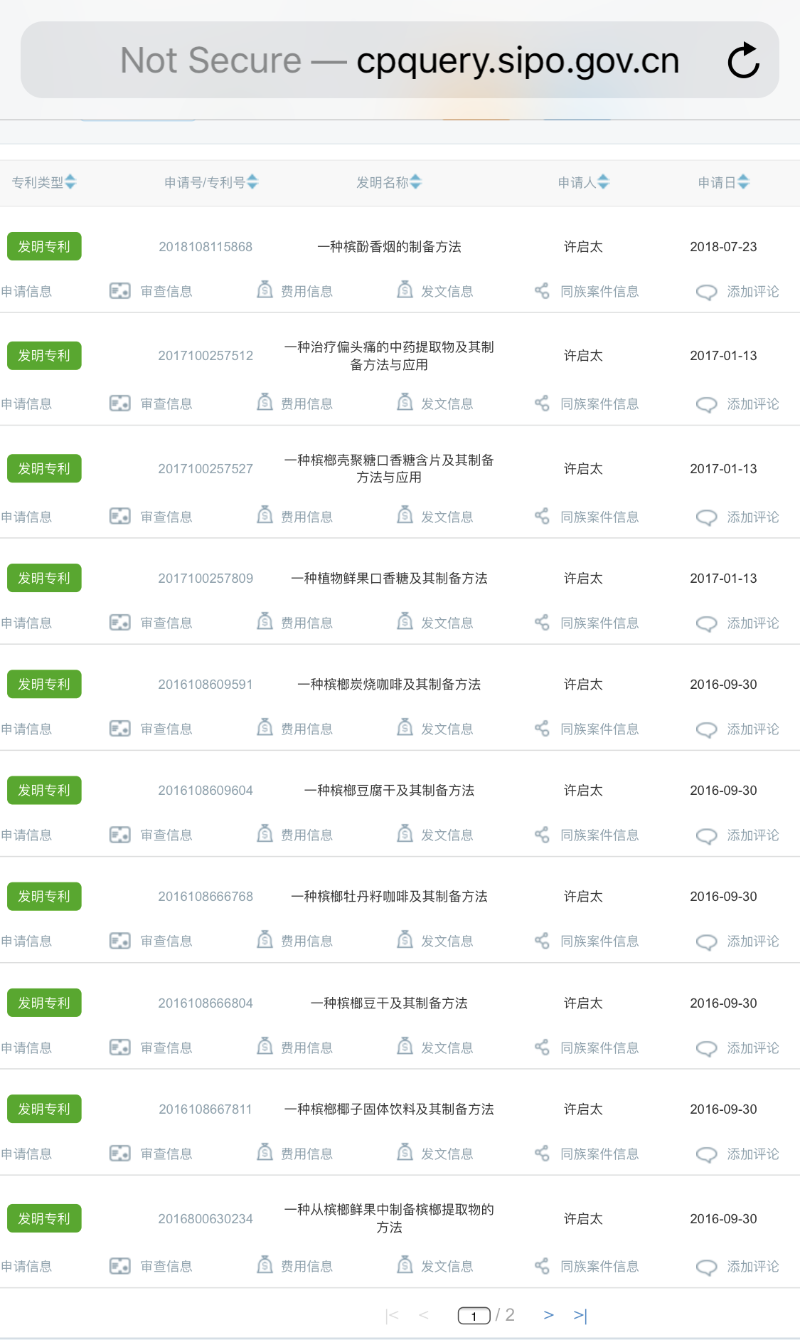 不过查询国家知识产权局专利检索系统,尚未发现名为“今珠多糖注射液”的相关专利,而许启太名下目前拥有的专利大多与槟榔有关,涉及槟酚香烟、无毒咀嚼槟榔、槟榔豆干、槟榔口香糖、槟榔炭烧咖啡、槟榔可乐等。目前许启泰名下的几家公司也都是与槟榔产业相关。
