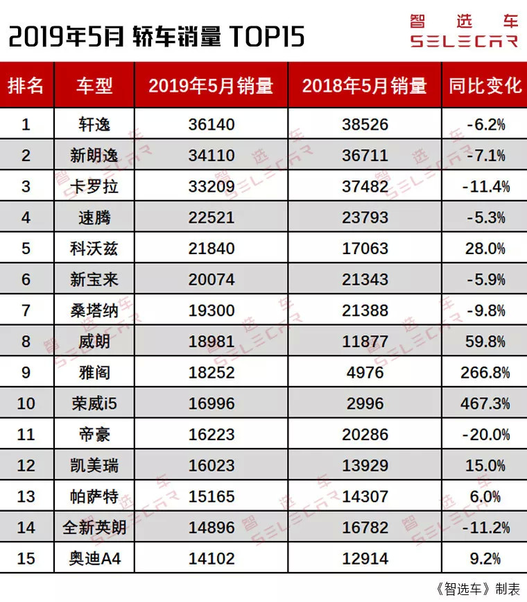 下面和小智一起来解读2019年5月份轿车销量排行榜中的前15名,小智会对前10名的车型进行简单点评。