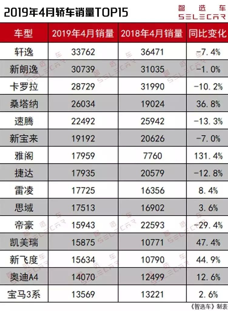 附上4月份轿车销量前15名: