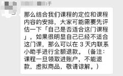 根据学习助理的要求,只要在课程领取、打卡前三天申请退群,是可以退还99元入群入群学费。然而退群之后,她却总迟迟拿不到退费,无论如何催促,学习助理在回信息时都只是承诺:下周退款。