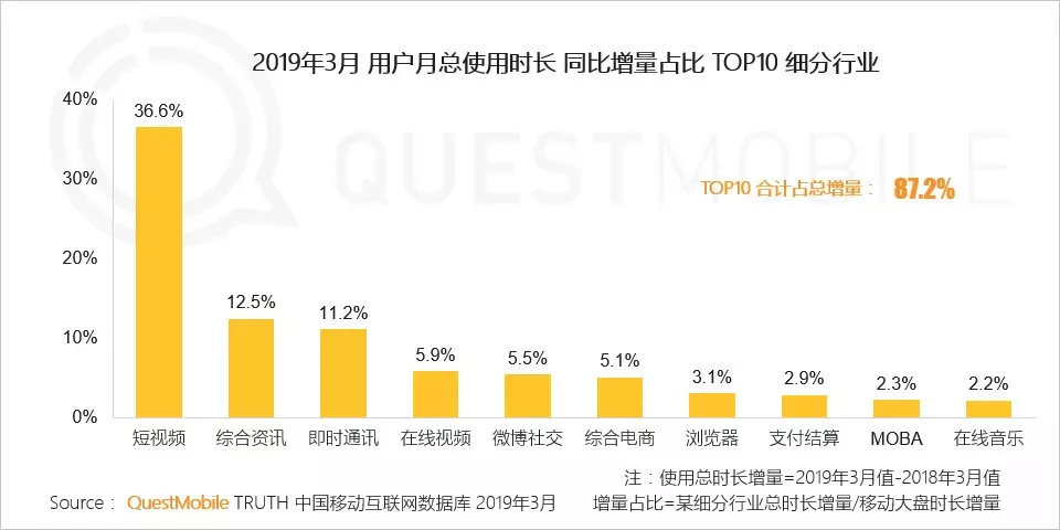 并且,从行业来看,短视频和综合资讯两个细分行业的时长增长贡献了整体时长增量的一半。其中短视频的用户月总使用时长占比36.6%,综合资讯为12.5%。