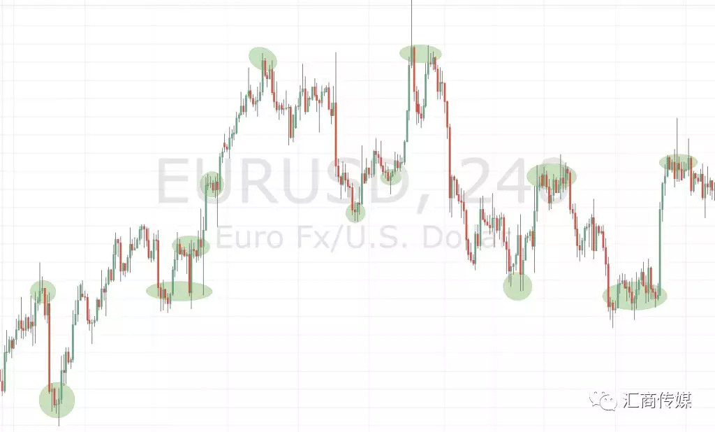 转折点指的是价格开始出现不同波动的那一个区域。这是大的价格波动出现的地方。转折点通常是支撑位/阻力位的一部分,而且你会发现,很多这种转折点常出现在同样的价位附近。