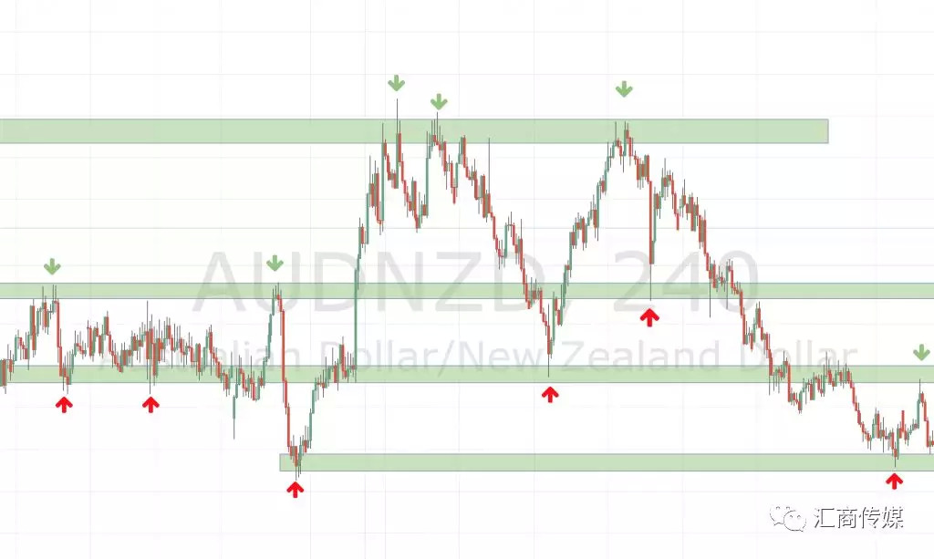支撑位和阻力位的概念是用来指向图表上价格反转的低点和高点。这些价位常常被测试。我想要强调的是,支撑位和阻力位并不是一条线,而是一个区域,比如下图标注出的绿色区域: