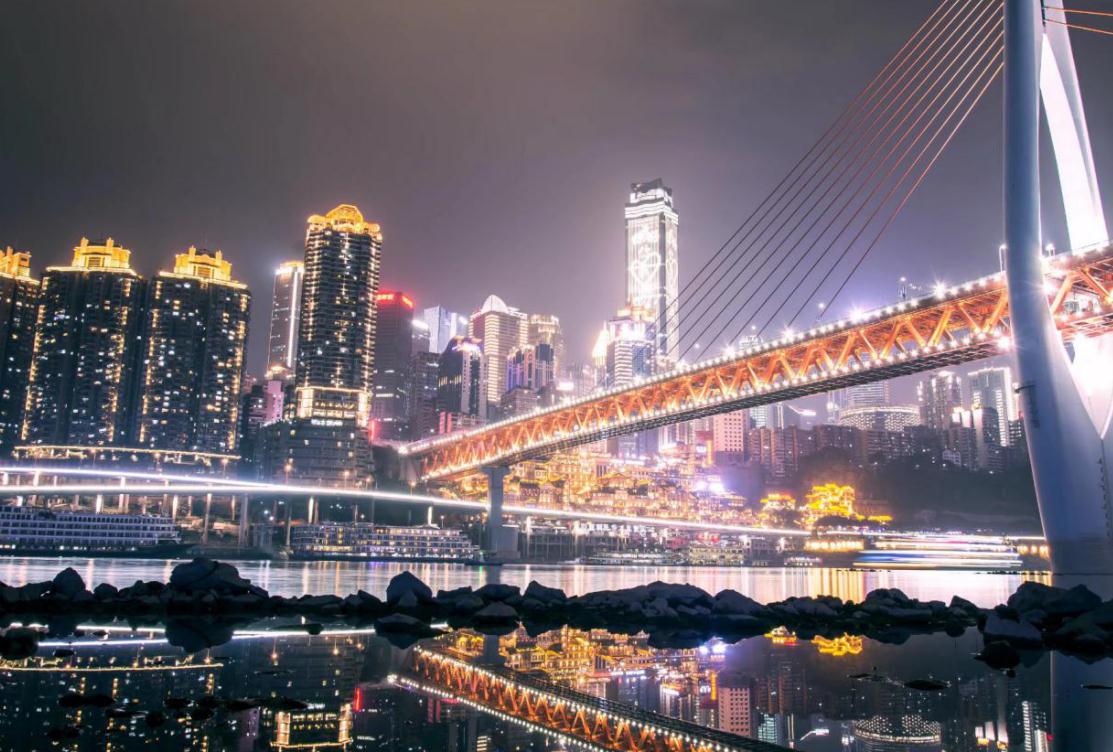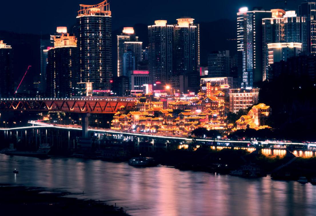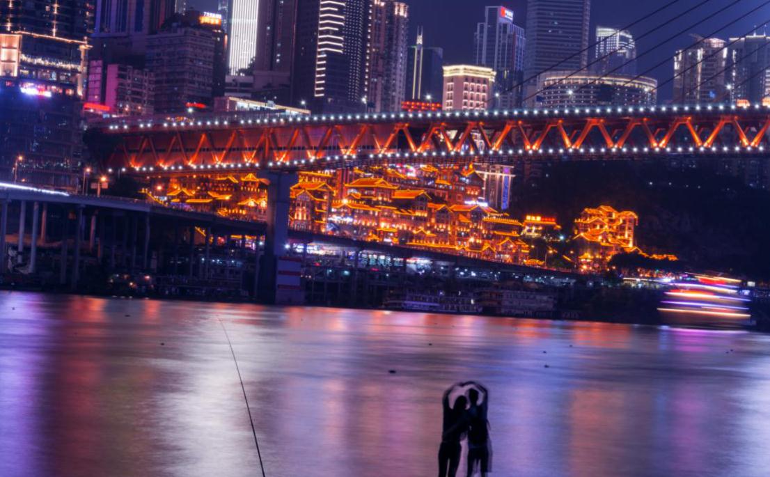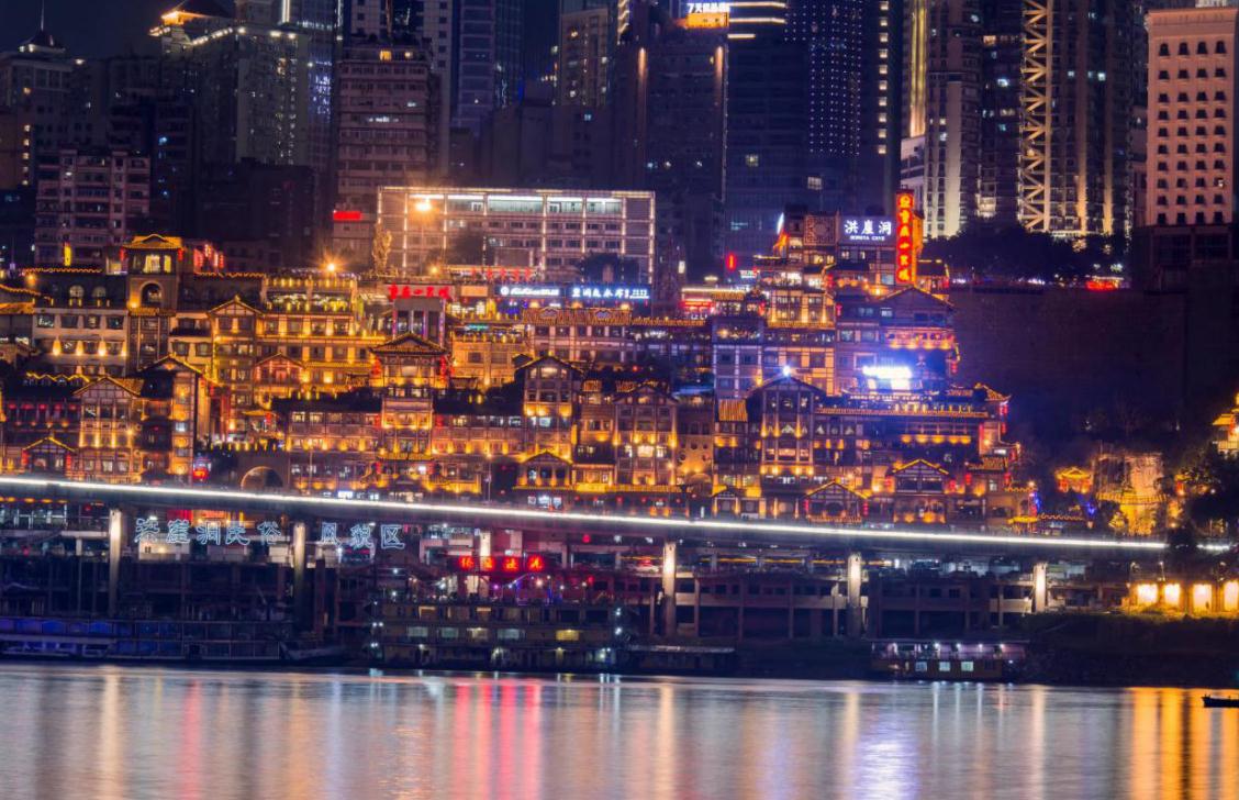 重庆两江怀抱,洪崖洞的吊脚楼在嘉陵江边依山而建、层层垒起。每当夜幕降临,灯火星星点点亮起,汇成一片阑珊光河。灯光将江面映亮,浓重色彩在粼粼波光中淡释。