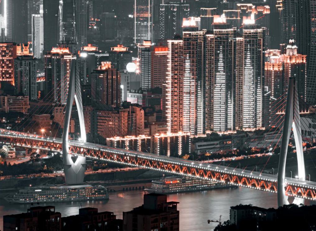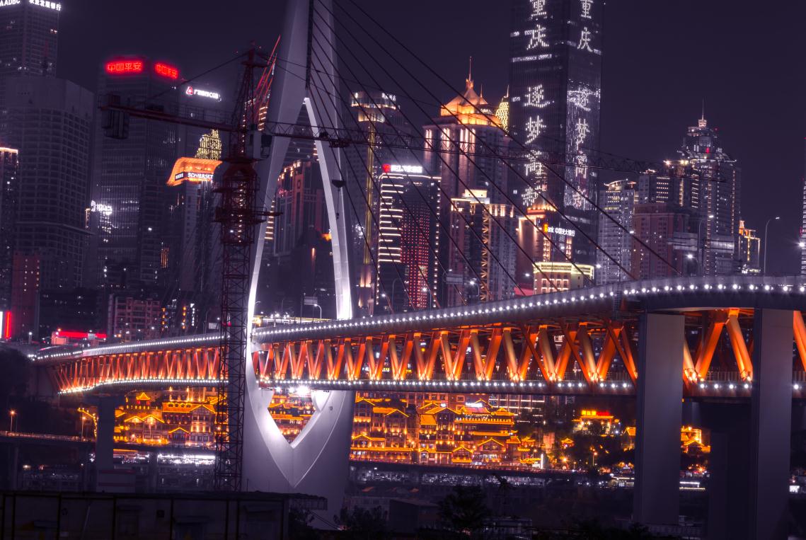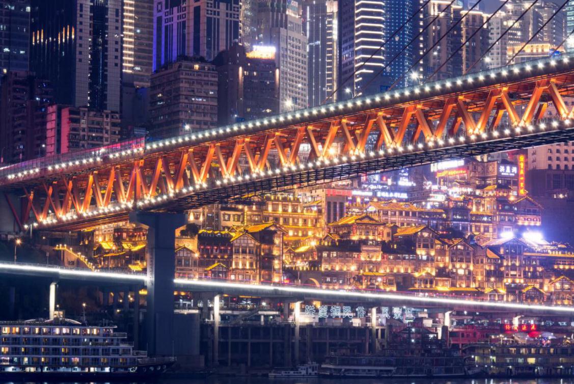 拍洪崖洞,不能漏掉与它相伴的千厮门大桥。跨过滔滔江水恒立于江面之上。红色桥体印衬着明亮的灯光,使得夜色中的两岸风光融为一体。