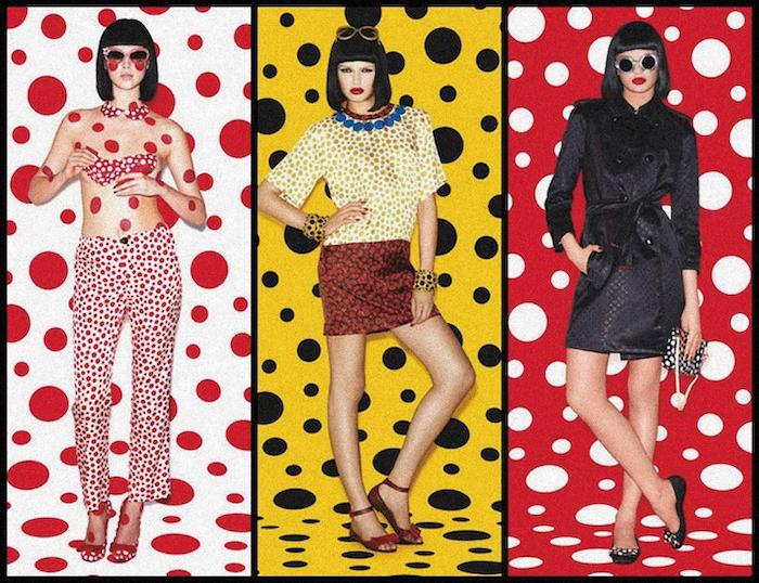 草间弥生(Yayoi Kusama,1929- )作品中那色彩鲜艳的抽象波点很容易被转化到商品表面。1990年代之后,她也加入了商业艺术的领域,与时装设计界展开合作,推出了带有浓厚圆点的草间风格的服饰,并开始贩卖许多艺术商品。奢侈品牌看到了她的价值,也纷纷和她合作。我看过一张照片,照片上奢侈品牌的代表在草间弥生两旁扶持着,那样子仿佛就是一种象征,油然而生出草间弥生被商业绑架的感觉。实际上,草间弥生总是乐于将自己的东西商业化。大凡商业利用艺术,总是会消解艺术中具有批判的力量,将其转化为单纯的视觉形象,因此草间弥生的圆点在商业中就变得极为普通了。