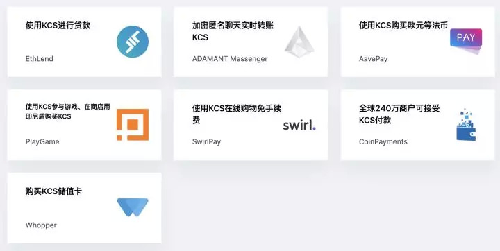 更让我们觉得吃惊的是 KuCoin Shares 作为 KuCoin 的生态代币,已经紧跟 BNB 的步伐,成功地拓展成为生态燃料。在 ETHLend 应用中,用户可以使用 KCS 进行贷款;在 ADAMANT Messenger 加密匿名聊天 App 里,用户可以实现 KCS 的实时转账;在 AavePay 里,用户的 KCS 可以直接用来购买欧元等法币;在 PlayGame 里,KCS 也可以用于购买游戏道具和线下法币入金购买 KCS;在 SwirlPay 购物平台,使用 KCS 进行支付,可以免除用户付款手续费;通过和 CoinPayments 合作,全球 240 万商家可以接受 KCS 付款;还有,在 Whopper 上可以直接购买 KCS 定制的实体储值卡。