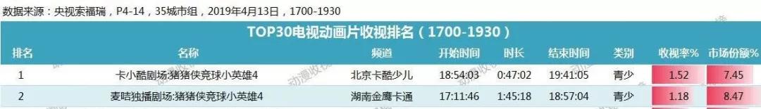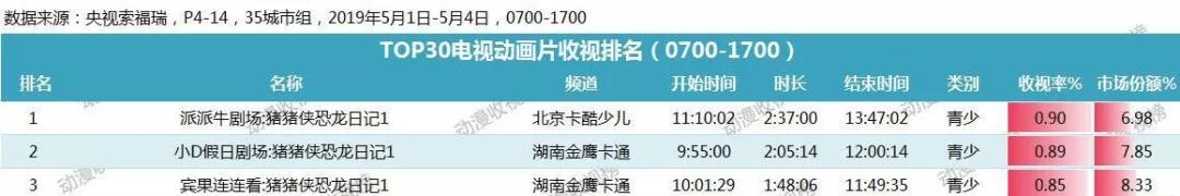 另一部新开播的《猪猪侠之恐龙日记》成绩也很优异,开播首日即登收视榜首。在5月1日至4日的五一假期,收视率前三都被《猪猪侠之恐龙日记》包揽。