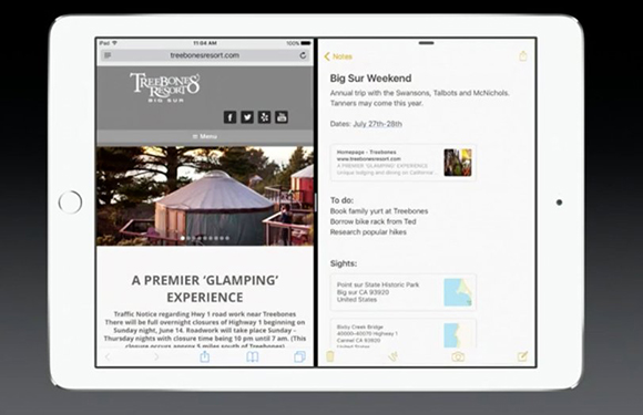 在将要更新的iOS 9中,你可以体验到苹果的“分屏操作”。在该模式下,用户可以在一个应用程序中罗列不同的操作界面:比如打开两份文档进行对比、或在浏览器显示两个标签页的内容。分屏比例可以是1:1,也可以是1:2(或2:1),新功能支持iPad Air/Air 2和iPad mini 2/3,在iPad Air 2上实现最佳。