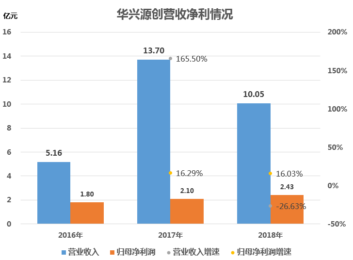 2016至2017年,公司营业收入由5.16亿上升到13.70亿,不过于2018年回落至10.05亿,年复合增长率为39.57%。归母净利润则以16%左右的增速稳步增长,由2016年的1.80亿成长到2018年的2.43亿。