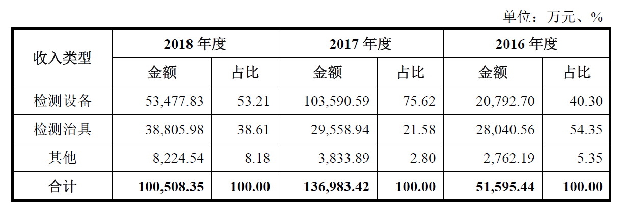 公司核心产品分为检测设备、检测治具,主要应用于 LCD 与 OLED 平板显示、集成电路、汽车电子等行业。2018年检测设备收入占比为53.21%,检测治具收入占比为38.61%。