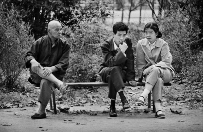 1978年,上海人民公园内,一对年轻男女并排坐在一张公园长凳上。他们之间没有肢体接触,但两人相向跷着二郎腿的动作和微微向对方倾斜的姿势流露出彼此的亲密。在长凳另一端坐着的老人严肃地盯着他们,眼神中流露出不认同。