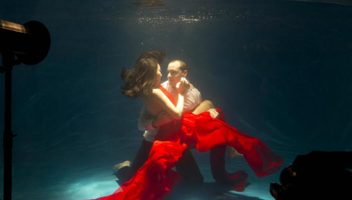 2016年,同样在上海,一对跨国情侣在摩托车上起了争执。“我想拍个水下婚纱照,”来自乌鲁木齐的Jenny说,“你知道吧,然后我们可以……”“我不要。”来自澳大利亚的David打断她。但男生还是向女生妥协了。女生穿着一条火红的长裙,在男生的怀里温柔凝视对方。两人潜入一个巨大的水缸,女生的发丝和裙摆在水波中飘荡开来。站在水缸外的摄影师迅速按下快门。
