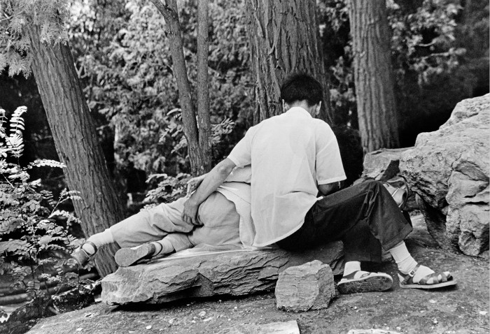 刘香成注意到人们开始小心又雀跃地尝试在公共场所出双入对,谈情说爱。1978年,他在上海人民公园拍到了一对在老人严肃注视下坐在长凳上聊天的情侣。1979年,他在北京动物园游人如织的马路旁拍到了一对背过身去谈恋爱的青年男女。“早些年,人们在公共场合还是比较害羞的,即使是你们在公园里坐得比较近,也会被人怒目而视,因为人和人之间距离过近被认为不符合规矩。”史密斯告诉界面文化(ID:BooksAndFun),刘香成在当时发现了一个有趣的现象,人们会在公园里大排长队,只为了有机会能坐下来“谈恋爱”,“光一起散散步可不行,意义可不如在公园里一起坐下来。”