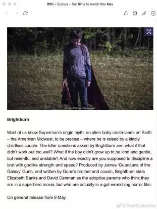 BBC对《Brightburn》的推荐语以“大多数人都知道关于超人来历的传说:一个外星宝宝紧急降落到地球上...”为开端,抛出“致命问题”、“如何驯化一个拥有天神力量和速度的顽童”一系列爆炸性看点,足见电影的另类属性。