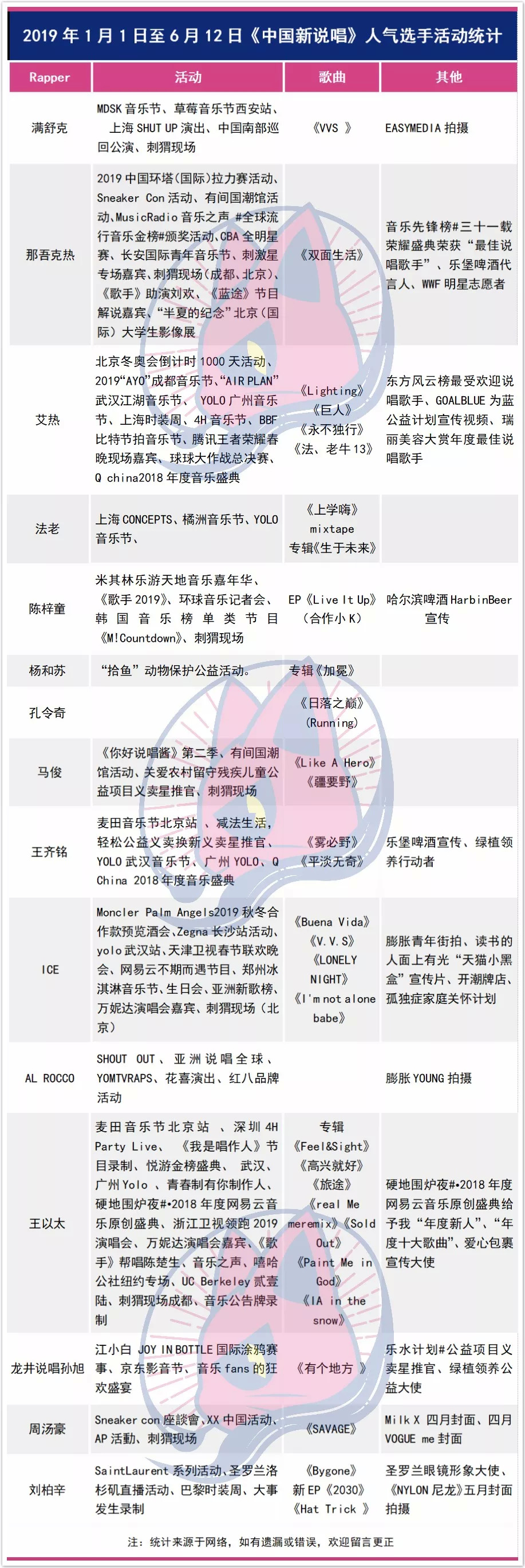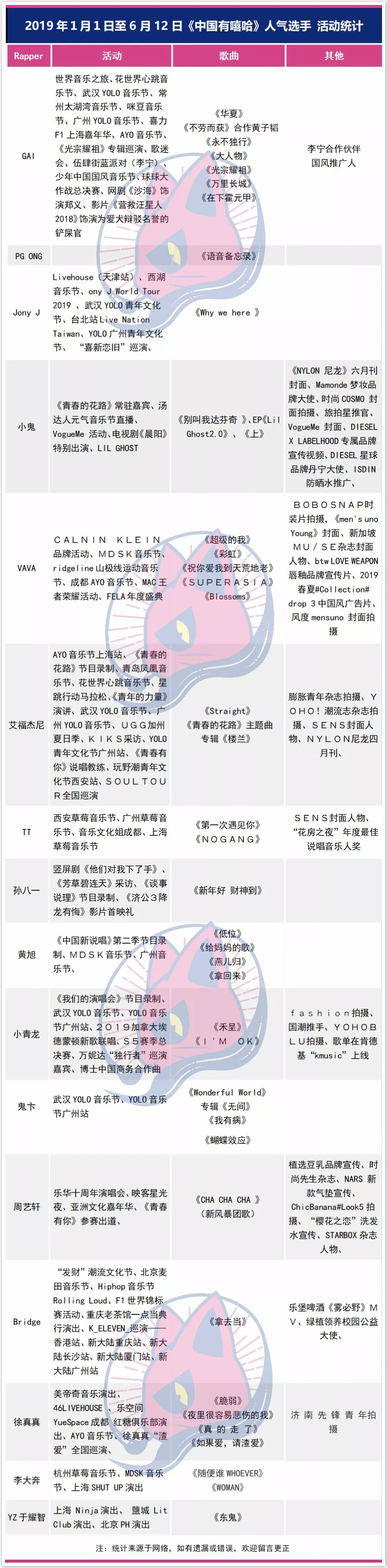 猫影文娱(ID:maoyingtv)整理表格发现,这一季当时不少人气选手如今在微博上已经找不到踪迹,节目过后发展不错的选手相对有所减少。此外,根据2019年的活动、歌曲发布等可以看出,《新说唱1》中发展最为不错是在第九期就被淘汰的王以太。除了麦田、Yolo各大音乐节外,他也似乎颇受主流银幕的偏爱。上个月,参加了拥有热狗、萨顶顶、周笔畅等一众实力歌手的《我是唱作人》,也同样收到了湖南卫视《歌手》以及浙江卫视领跑2019演唱会的邀请。