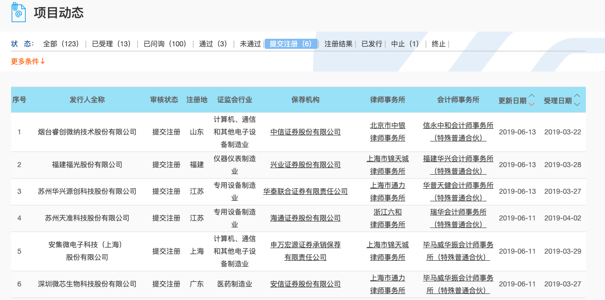 值得注意的是,上述两家企业并非首批通过科创板上市委审核的企业。据上交所公布信息,已申报科创板的123家企业中,共有6家显示“提交注册”。除华兴源创和睿创微纳外,福光股份、天准科技、安集微电子、微芯生物也已进入注册阶段。