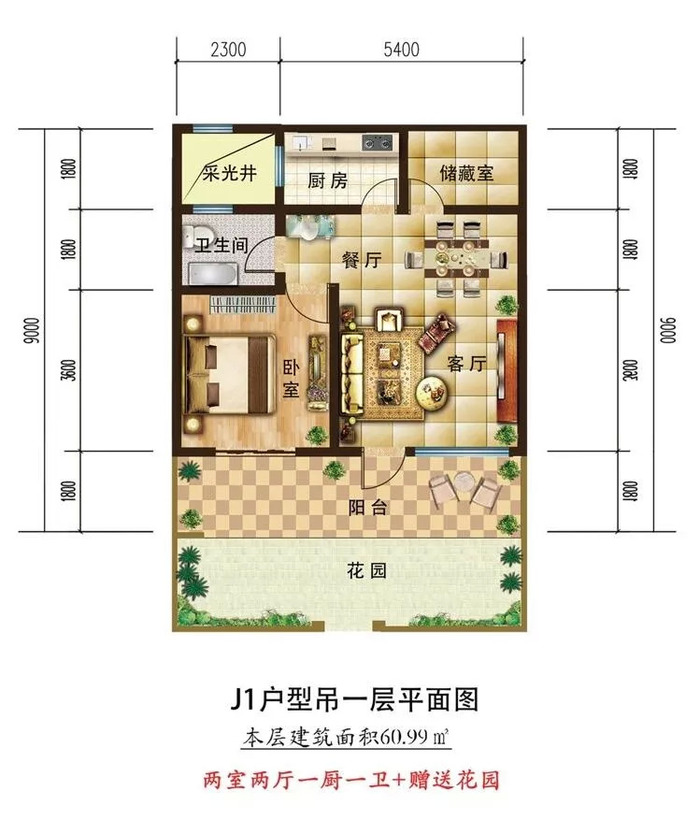叠加别墅/建筑面积60.99㎡/两室一厅一厨一卫+赠送花园