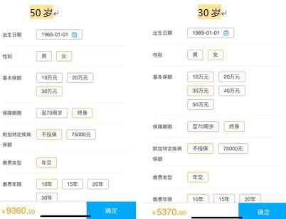 如果父母年龄超过50岁,买重疾险就不太划算了,保费高,保额低,保险杠杆低,保障年限短。以市面上某款重疾险产品为例,针对50岁人群,最高保额只有30万元,而30岁人群可选保额就扩大到50万;在缴费年限为10年、保障至终身的情况下,50岁女性每年需要缴纳的保费高达9360元,比30岁人群的保费多70%。