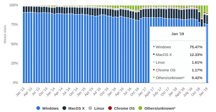 Windows系统仍然是市场的主流。虽然Linux的发展历程很振奋人心,但是市场上的占有率实际上只有1.61%(如果将谷歌的Chrome OS也看作Linux的一部分,则合起来是2.78%)。
